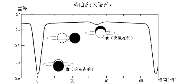 大陵五屬於「食變星」,一亮一暗的星在互繞的過程中,從地球看過去的視線上,正好會發生「食」的現象,使總亮度下降,而產生變光現象。