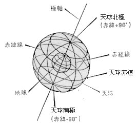 以地球為中心,可以假想所有的星星位在一個大球殼上,這個大球稱為「天球」。天球會以極軸為旋轉軸,由東向西繞著地球轉(事實上是地球由西向東自轉的結果,而極軸正是地球自轉軸的延伸)。如同在地球上用經度、緯度表示座標,天文上用「赤經」、「赤緯」表示天球上的位置。