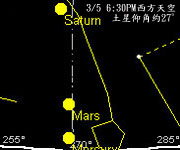 但大體來說,今年春天水火土這三顆星日落之後在天空中的仰角都不高,三月份,七點後它們就應不易看見了。四五月份則更早,六點多可能就已經不見蹤影。 |