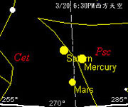 水星,三月初每天同一時間它的仰角都會越來越高,下旬以後,則開始降低。但即使如此,它仍然都在地平線附近徘徊。