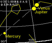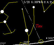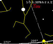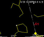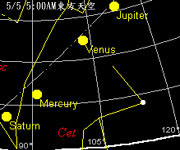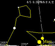 四月中以後,傍晚就看不到水星了,要看它,得起個大早了。 金星在傍晚則是見不到他的芳蹤,但是仍可以在凌晨於東方天空見到它的出現。 火星,我們也可以在日落後的西方地平面看到它。 木星,這顆光度僅次於金星的亮星,在傍晚是看不到的。今年春天,要看木星得在凌晨才行。到了五月初,如果你徹夜不睡,可以在凌晨時見到金星和木星兩顆亮星依序升起呢! 土星則在雙魚座附近,3月初到四月下旬,可以在傍晚的西方天空找到它,四月下旬後,就得在凌晨才能看見它了。 |