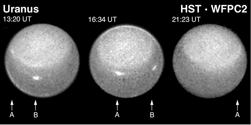 A、B箭頭所指的就是那一對亮雲,科學家們希望藉此測定天王星南半球的風速