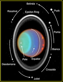 天王星一共有10個內衛星,照片上則只顯示了8個,它們分別是: 天衛8"Bianca"、天衛9"Cressida" 、天衛10"Desdemoria"、天衛11"Juliet"、天衛12"Portia"、天衛13"Rosalind"、天衛14"Belinda"、 天衛15"Puck"。剩下的兩個天衛6和天衛7,因為處於Epsilon環的內外側,被環的亮度掩蓋而無法顯現。