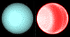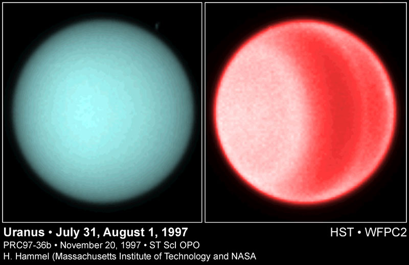 左圖水藍色的影像,表示人類肉眼看到天王星的樣子。右圖紅色的影像以波長6190埃攝得,敏感於 天王星上甲烷分子的吸收程度,從圖上可以很明顯地看出雲層的帶狀結構。