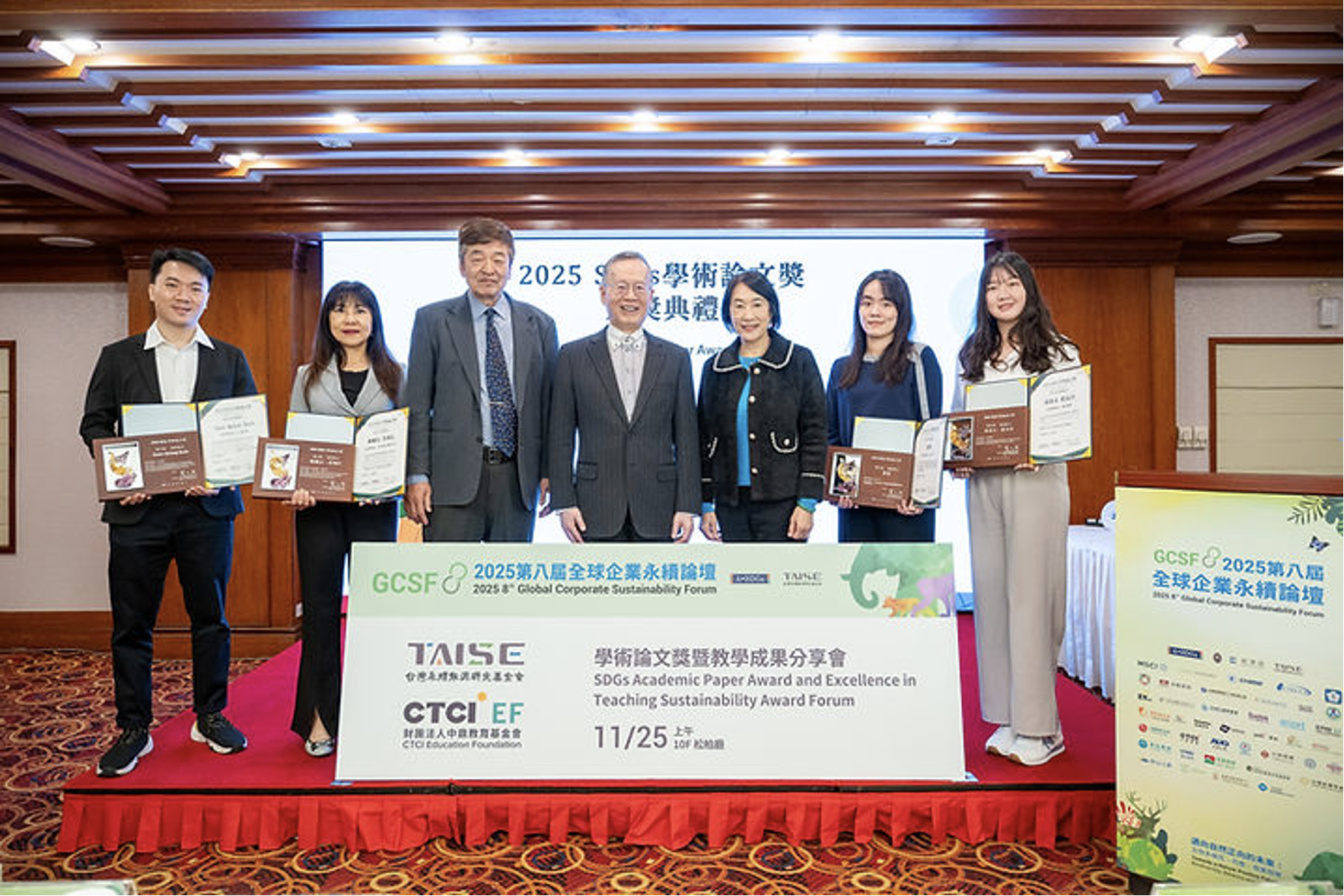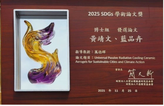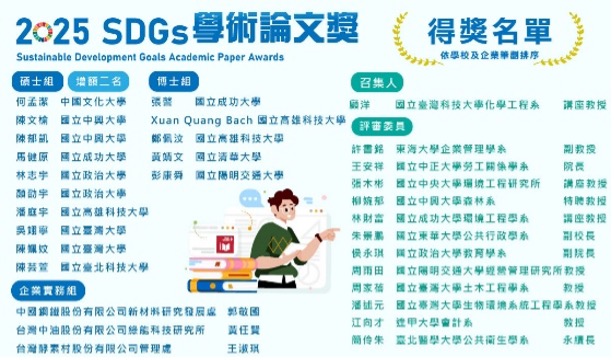恭喜黃靖文同學、藍品卉同學(指導教授:萬德輝)於2025第八屆全球企業永續論壇中,榮獲 2025 SDGs學術論文獎殊榮,本次獲獎展現研究成果在永續發展議題上的學術價值與實務貢獻。
